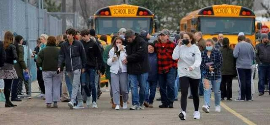 11月30日,密歇根州底特律郊区的牛津高中发生枪击案,一名15岁学生向同校学生开火,造成四名学生死亡,七人受伤。图为牛津高中的学生在枪案发生后被家人从学校附近的超市停车场接走。