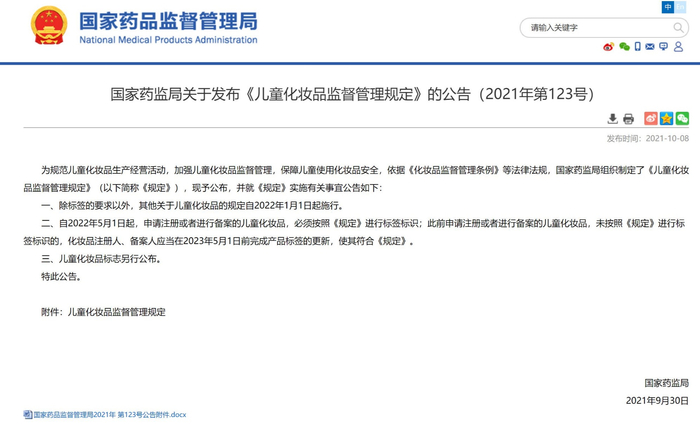 今年9月,国家药品监督管理局发布《儿童化妆品监督管理规定》,明确儿童化妆品是指适用于年龄在12岁以下(含12岁)儿童,具有清洁、保湿、爽身、防晒等功效的化妆品。《儿童化妆品监督管理规定》指出,儿童化妆品配方设计应遵循的“安全优先、功效必需、配方极简”三大原则;此外,儿童化妆品还应当通过安全评估和必要的毒理学试验进行产品安全性评价。