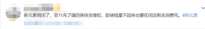 值得注意的是,新元素的官方微博的最新一条信息,是10月29日发布的双11“买1000送500”的储值卡活动,线上商城及线下商城同步销售。