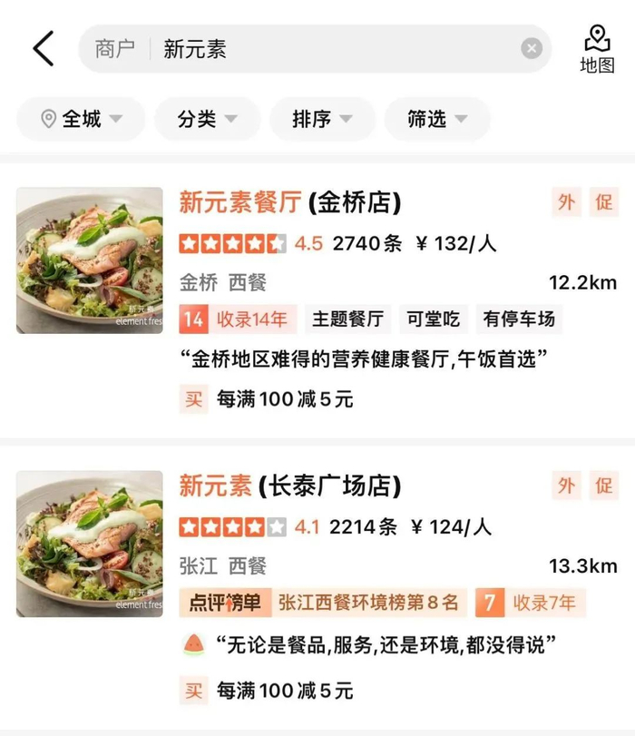 记者搜索大众点评,上海新元素门店显示尚在营业的为10家。