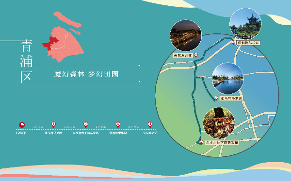 浦江之首→上海国际森林营地→香薇玫瑰庄园→吾舍农场→泖田湿地→家绿彩虹农场→八十八亩田→云间粮仓→广富林郊野公园→上海辰山植物园