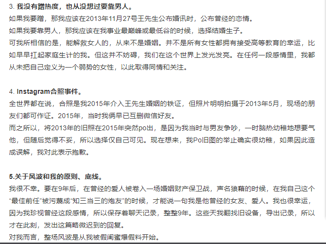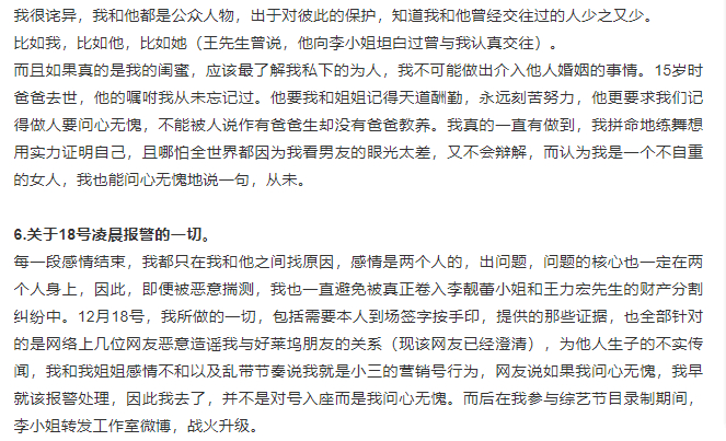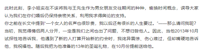 之后,李靓蕾再度发文回应Yumi,说王力宏没承认过有跟Yumi正式交往,“王先生2012年跟我说你只是有发生过关系的"朋友"”,还称Yumi提供的“分手”对话看起来不太像是“正式情侣”分手会有的对话,2013年她和王力宏大部分时间都在一起,而且已经被男方介绍亲友认识。