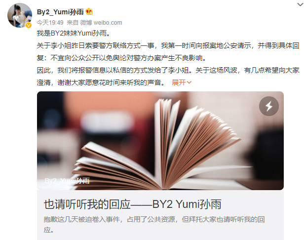 19日晚,By2成员Yumi称从未介入王力宏与李靓蕾的婚姻,两人是在2012年交往,与王力宏2015年互删了微信好友。并表示工作室已经将报警信息以私信方式发给了李靓蕾。