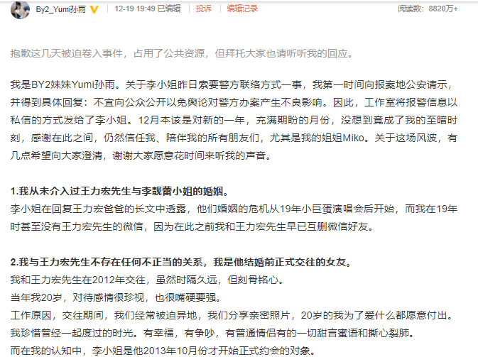 12月19日晚,被传插足王力宏与李靓蕾婚姻的@By2_Yumi孙雨发长文回应称,自己不蹭介入二人婚姻,与王力宏也曾有过一段时间的正式交往。随后,李靓蕾两次回应Yumi的长文内容,称yumi与王力宏删除好友后,又改使用其他方式联系,并直言二人不太像是“正式情侣”。