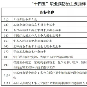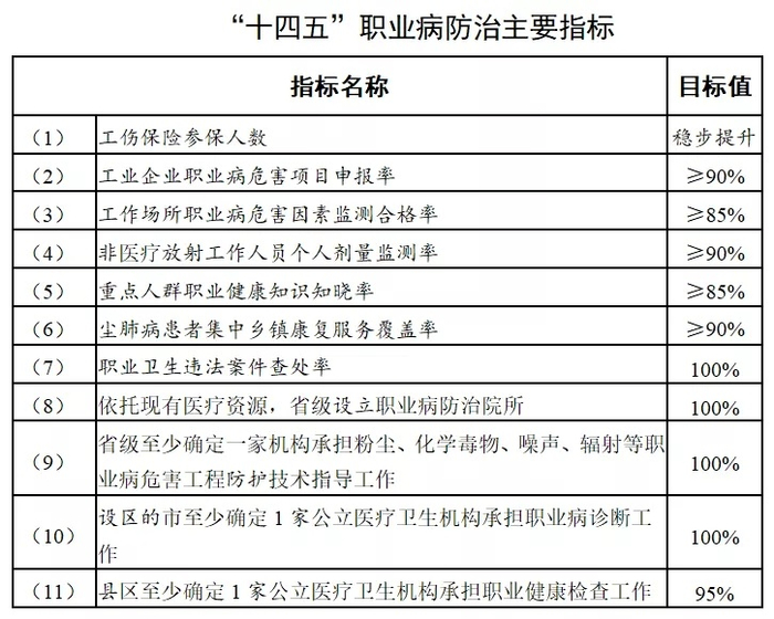 《规划》明确了“十四五”时期职业病防治工作的11项主要指标,为了体现高质量发展对职业健康工作提出的新要求,提出了一些新的指标。为了与健康中国行动的有关指标相衔接,把职业健康保护行动中一些指标也纳入规划指标之中。