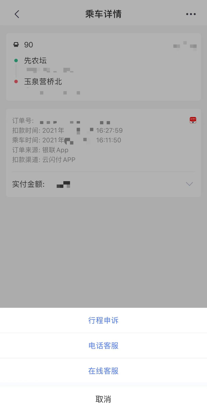 在此期间,乘客刷码乘车时如出现上下车站点信息缺失问题,可拨打4000009966客服热线或从“北京公交”App中联系在线客服及时处理。为减少等待时间,乘客也可采取更快速、便捷的方法,在“北京公交”App中进入“乘车记录”页面,点击出现异常的行程,再点击“乘车详情”页面右上角的“…”按钮,进行“行程申诉”;或是拨打客服热线,进行语音留言;或是在新浪微博中,给“北京公交APP”私信留言,乘客需提供手机号码、乘车时间、路线、异常站点信息和实际上下车站点等信息,后台人员将在48小时内处理完成。如乘客购买了“云闪付”App的优惠乘车票卡,在行程没有享受到优惠时,也可拨打95516服务热线,向客服提供乘车信息,客服会根据情况核实处理。