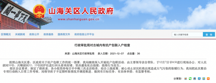 12月7日,山海关区行政审批局在区政府官网宣传称,对古城内的相关胡同封炉灶进行回头看再封堵