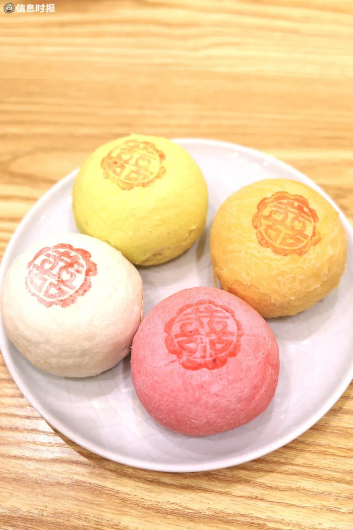 不同颜色的喜饼中,裹藏的馅料也不尽相同。“白色是爽糖馅、红色是莲蓉馅、黄色是五仁馅、橙色是豆沙馅,这是最传统的搭配。”
