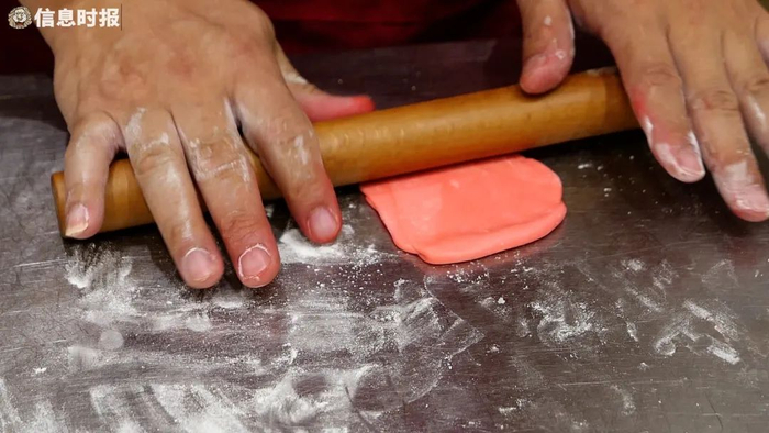 面粉、猪油、水这三种食材,是制作礼饼的主要原材料。从原料到做出一只精巧的嫁女饼,需经过开皮、开酥、包馅、上色、盖印等步骤。每个步骤环环相扣,其中最关键的是开酥的方式。为了令嫁女饼口感酥软松化,谢颖春介绍,每只嫁女饼都需要经过“开小酥”。