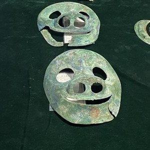 在现场的文物展示台上,新出土的青铜面具、兽面形铜饰、成组的铜车马器、铜戈等整齐排列,只见它们纹饰精美、细节丰富。