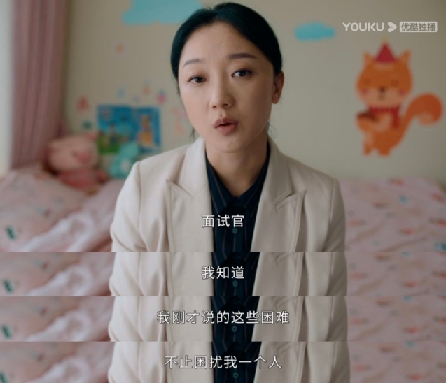 剧中,作家詹璐是一位二胎妈妈,在生下小儿子后,患上了产后抑郁,丈夫、婆婆的关注点都在小儿子身上,自己想要重回职场却屡屡碰壁。对于面试官提出的“如何保证重回职场后,家庭和工作不冲突”的问题,詹璐坦言自己无法保证。