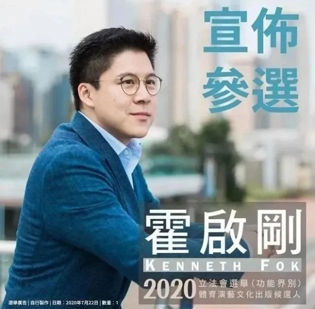 2020年7月22日晚,霍启刚在脸书发文,正式宣布在体育、演艺、文化及出版界参选,并在7月23日报名。霍启刚表示,希望可以利用立法会平台,善用多年累积的经验、人脉、资源,为业界服务。