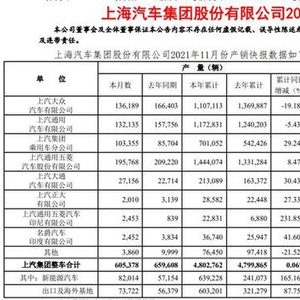 12月7日,上汽集团发布11月产销快报,数据显示,11月份上汽实现整车销售60.1万辆,同比下降6.61%;1-11月,上汽集团累计销量达480万辆,累销同比下降1.06%,跌幅扩大。年初立下的销量目标,上汽集团只达到了70%的完成度。