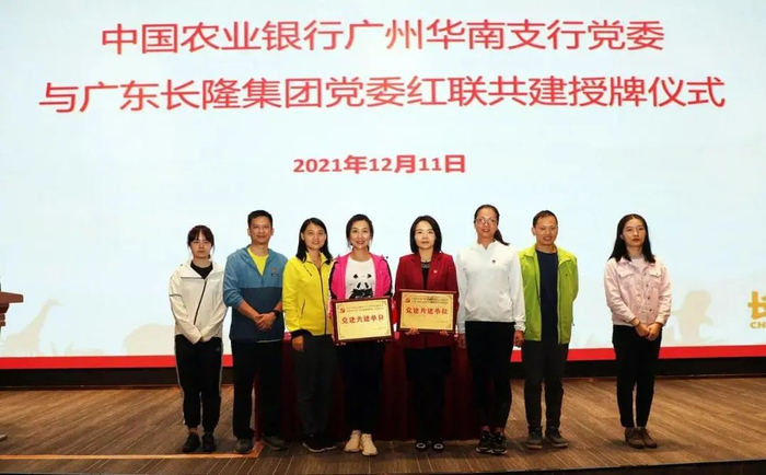 由长隆集团党委委员、长隆总部直属党支部书记杨映婷同志和中国农业银行广州华南支行党委委员陈媛媛同志签订共建合作协议书并互换了共建牌匾。
