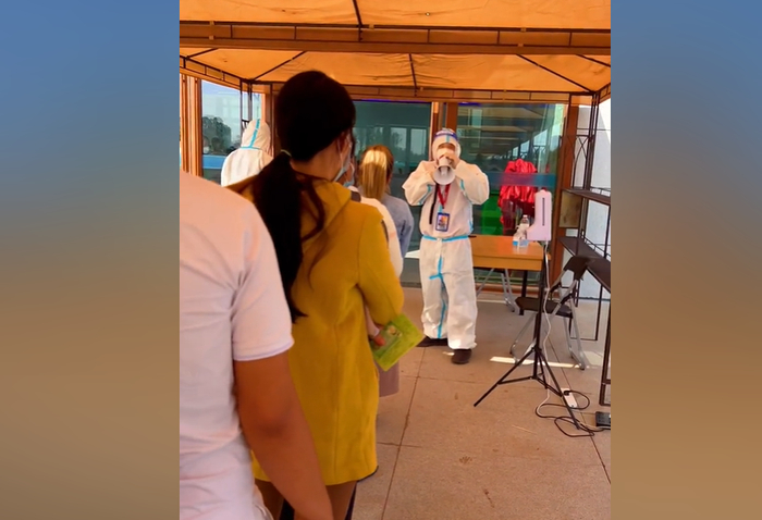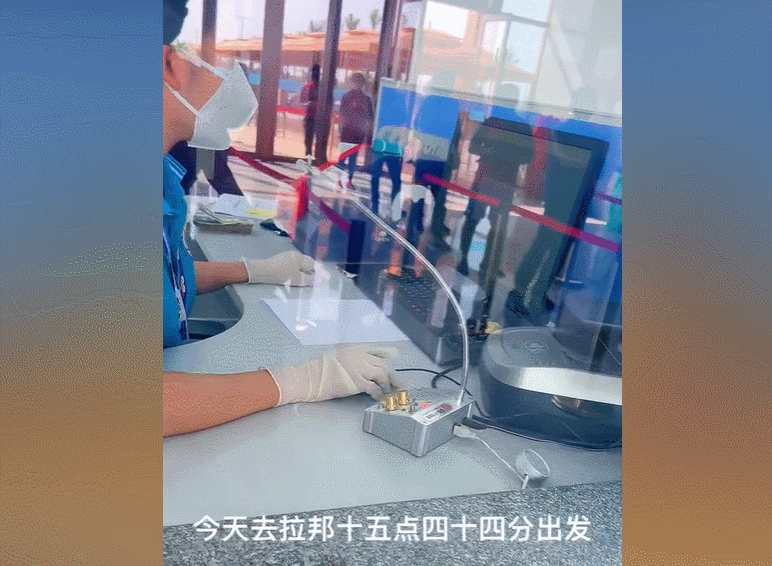 到了售票大厅外的排队棚,亲切的大喇叭出现了,身穿防护服的工作人员提醒旅客准备好疫苗卡和身份证明。