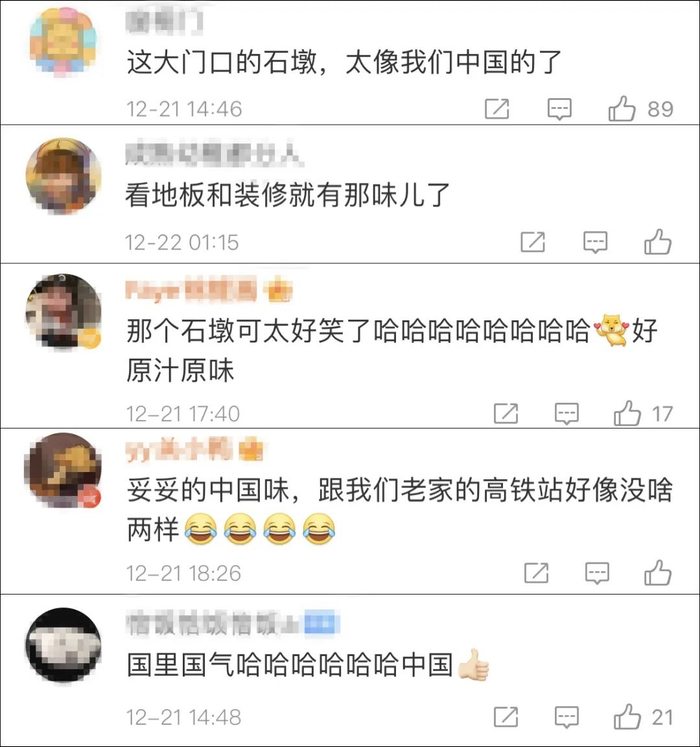 中国网友立马“闻墩识国味”,留言感叹,这也太像咱们老家的高铁站了,“国里国气”。