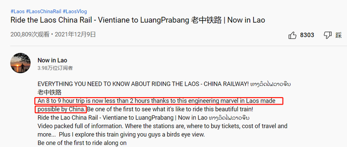 12月9日,Youtube博主“Now in Lao”就在发布的视频配文中感叹:“多亏了中国在老挝创造的工程奇迹,原来要8、9个小时的旅途现在只要不到2小时。”