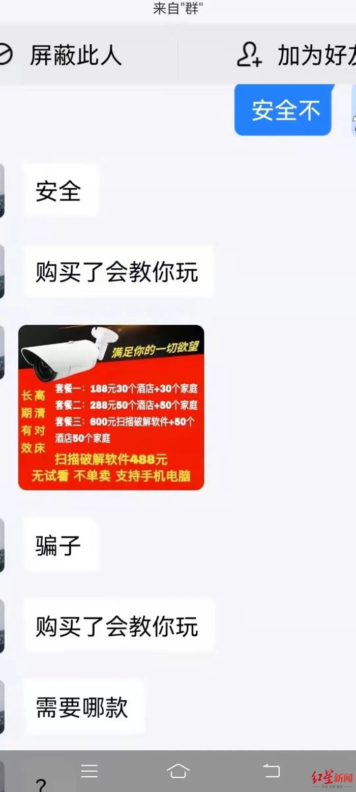 报价信息中还包括可以购买摄像头扫描破解软件,单买488元,扫描破解软件、50个酒店、50个家庭打包800元。卖家还表示,购买后“会教你玩”。但见记者只问不买,没有“诚意”后,卖家很快把记者踢出了群。