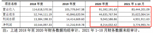 2020年和2021年1月-10月,迪尔药业分别实现营收9159.22万元、8344.42万元,净利润仅为821.4万元和377.49万元。