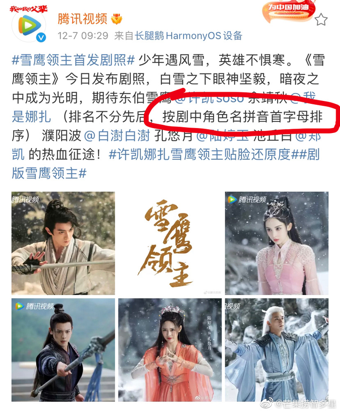 其实,这已经不是该剧第一次整类似操作了,为了“端水”,去年10月,《雪中悍刀行》官宣全体演员的时候花样更多,直接分了个“英雄榜”和“红颜榜”,说白了就是男主演和女主演。