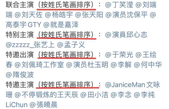 可悲的是,这种现象,在内娱越来越多见了,番位花样“卷”起来了:按年龄、按角色名拼音首字母、按演唱顺序、按歌曲上线时间、按参演剧集播出时间由近及远……姓名首字母相同怎么办?没关系,再按名字第二个字的首字母排。