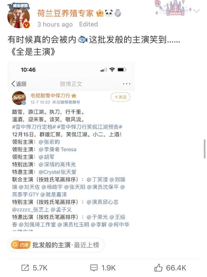看起来是专业的班底,可该剧今天(12月7日)刚官宣定档,长到让人迷惑的主演名单就引发了热议,“分猪肉”能分成这样,真是重新定义主演。