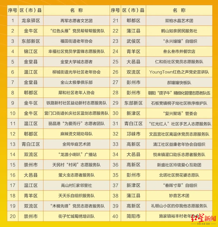 红星新闻记者从成都市委社治委获悉,“在社区·爱成都·做文明城市行动者”2021年社区文明实践志愿服务暨和谐邻里关系先进典型评选活动经过广泛征集、组织评审、核查确认等环节,公平、公正、公开地评选出了10名社区文明实践志愿服务“十大感动人物”、8个社区文明实践志愿服务品牌项目,以及40名蓉城好邻居、40个邻里好组织、40个邻里好活动。