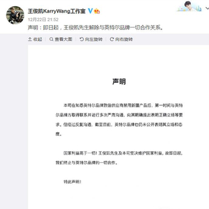王俊凯工作室表示,国家利益高于一切,王俊凯及公司坚决维护国家利益,故即日起,终止与英特尔品牌的一切合作。