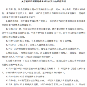12月22日,河南周口沈丘县在核酸检测中发现4例阳性人员,其中,确诊2例,无症状感染2例,属西安自驾返沈人员。目前,均已转送至郑州市新冠肺炎定点医院救治。现将初步流调发现主要活动轨迹通报如下: