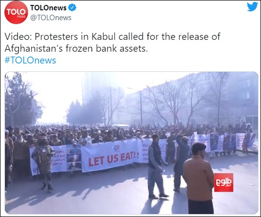 12月22日,在阿富汗首都喀布尔,数百名抗议者穿过街道,来到已经关闭的美国大使馆,敦促美国解封被冻结的阿富汗资产,他们举着“让我们吃饭”和“把冻结的钱给我们”的横幅,高呼口号,沿着中央大街游行。