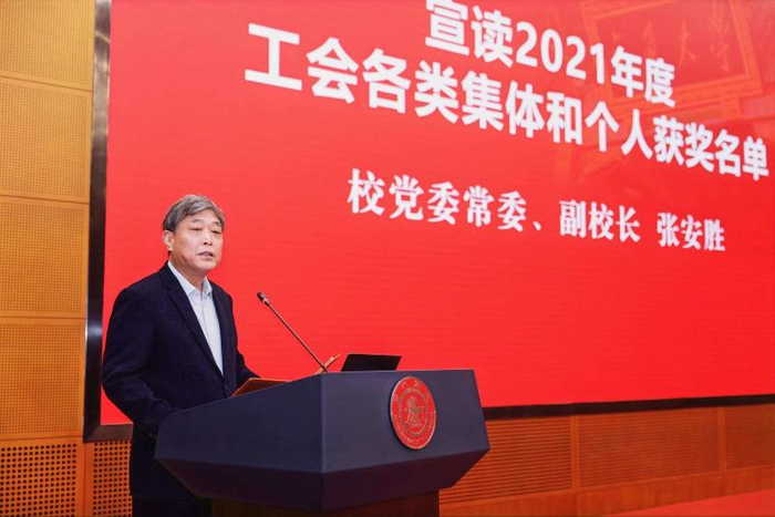 张安胜宣读2021年度工会系统各类集体和个人获奖名单。樊春海化学生物学与转化医学团队、贾金平绿色化工团队、刘江来粒子天体物理团队获评上海市教育系统“劳模创新工作室”,刘晓晶获上海市五一劳动奖章,李政道研究所建设指挥部、半导体异质集成材料中心获评上海市工人先锋号,教工合唱团、教工国标舞协会等8家荣获市级及以上荣誉的文体协会获校工会“突出贡献奖”,生物医学工程学院工会、航空航天学院工会等22家基层工会获校工会“2019-2020年度先进基层工会”奖,船舶海洋与建筑工程学院工会、机械与动力工程学院工会等21家基层工会获校工会“2019-2020年度模范基层工会”奖。杨振斌、张安胜等为获奖单位和个人颁奖。
