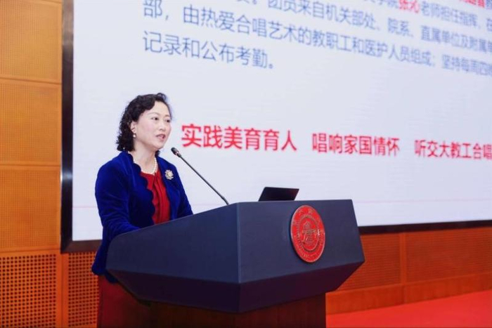 物理与天文学院工会主席徐海光、教工合唱团常务副团长刘路喜作为获奖集体代表先后分享工作经验。