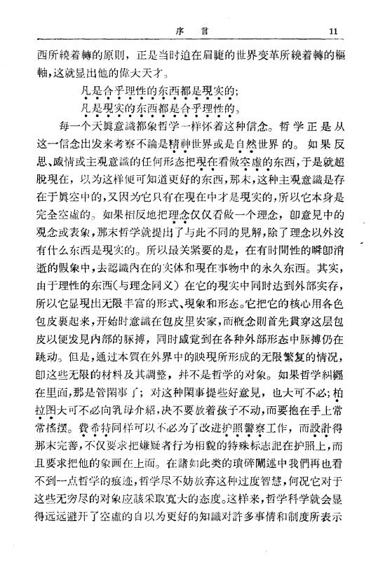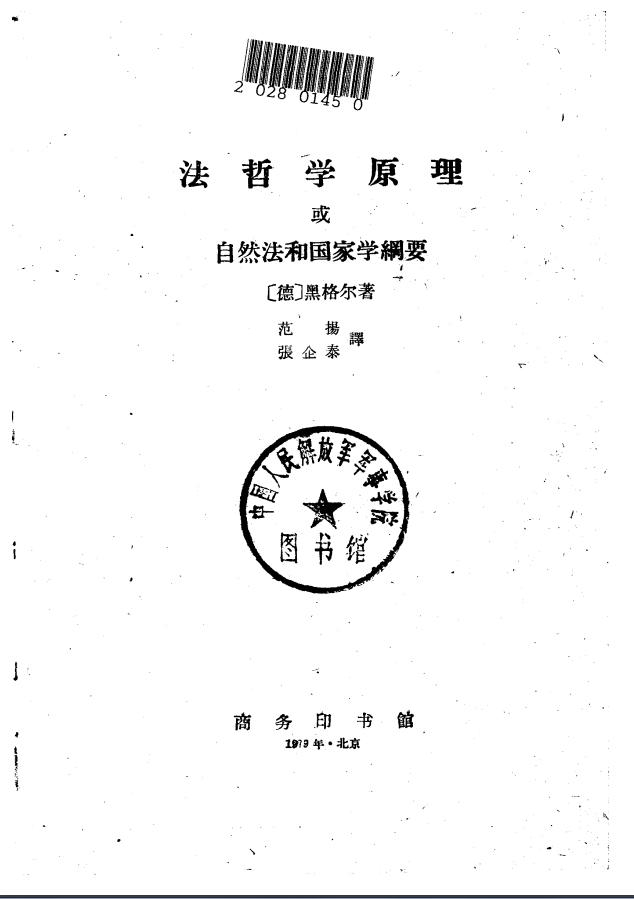 《法哲学原理——或自然法与国家学纲要》(1979年,商务印书馆出版,范扬、张企泰翻译)的序言中写道: