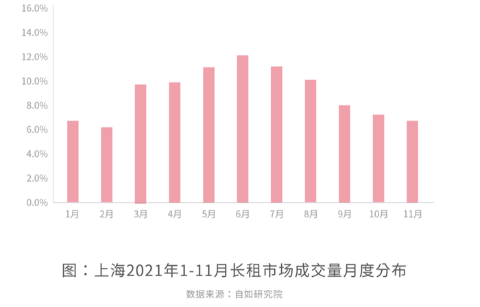 成交量的时间分布显示,2021年上海长租市场淡旺季明显。上半年呈“低开高走”的态势,成交量自年初淡季后一路攀升。其中,3月白领季成交量环比上升58%,为全年增长最快的月份,而6月毕业季则成为全年成交量高峰。行至下半年,长租市场成交量略有收缩,但整体仍保持在较高水平。