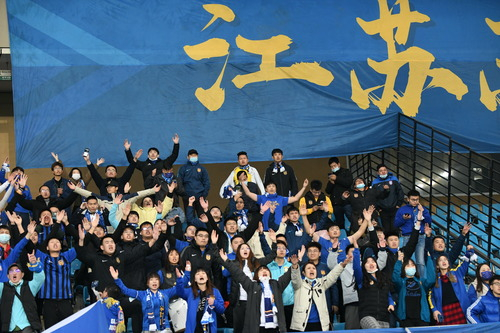 2020年12月12日,江苏苏宁易购队球迷在看台上为球队加油。新华社发史康摄