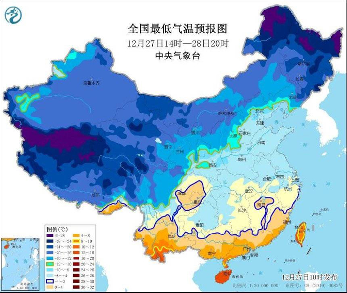 自12月26日起,本轮寒潮的大范围强降温过程趋于结束,但寒潮影响过的大部地区依旧比较寒冷,中央气象台12月27日10时继续发布低温蓝色预警。