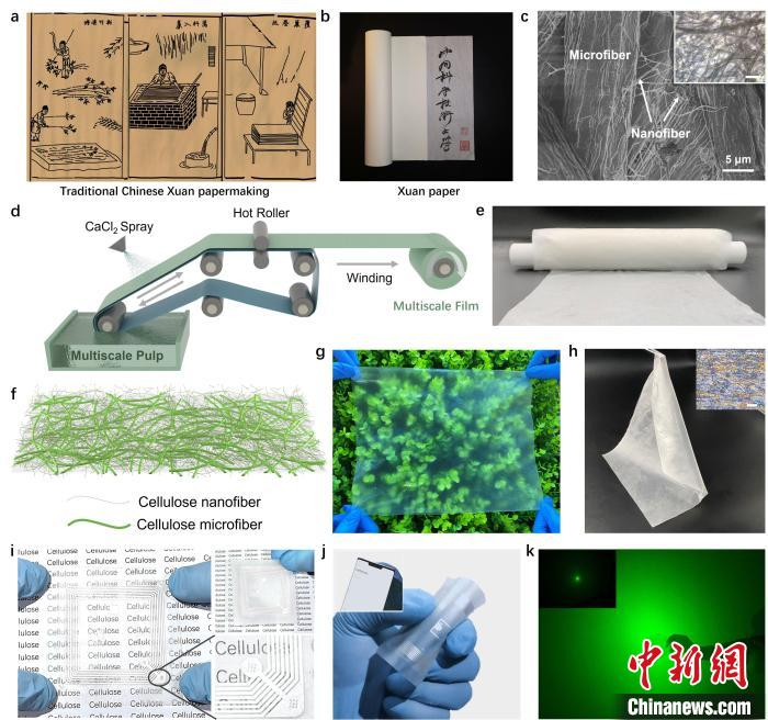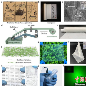 受宣纸启发,研究人员通过将微米纤维素和纤维素纳米纤维组装成多尺度结构,制备出高性能透明可折叠薄膜,通过“卷对卷”工艺可连续化生产。基于该薄膜制作的近场通讯电路电子器件,兼具高透明度、高雾度和优异的柔韧性,在弯曲时仍可准确地记录和读取信息。