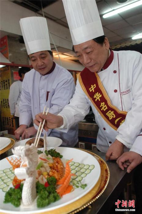 2007年2月,在沈阳第十一届副食节现场,刘敬贤现场制作“满汉全席”菜肴。中新社发 黄金昆 摄