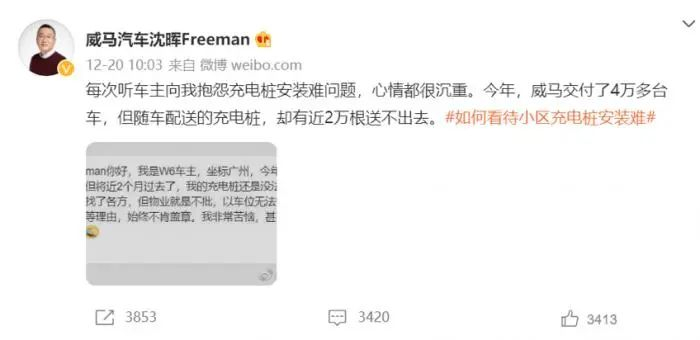 “每次听车主向我抱怨充电桩安装难问题,心情都很沉重。今年,威马交付了4万多台车,但随车配送的充电桩,却有近2万根送不出去。”12月20日,威马汽车创始人沈晖在其个人微博账号发文“吐槽”私人充电桩安装难的问题。