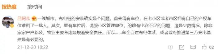 “一线城市,充电桩的安装确实是个问题。首先得有车位,在老小区或者市区拥有自己的产权车位难倒了一批人。其次,拥有车位后,说服小区管理单位。的确有电容不足的问题,这是少数情况,除非家家户户都装,物业主要考虑是规避安全责任……”沈晖微博发文后,有网友表示。