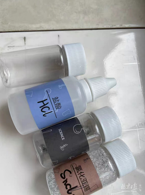 这种简陋透明塑料袋装,也导致里面的化学内容物状态十分不稳定。有家长表示,小朋友购买的“点水成冰”套装,里面的溶液刚撕开一接触到空气就凝结成“冰”,根本来不及做实验。