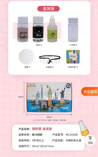 一套金属提取“锡 刺猬”的科学小实验套装含有盐酸、氯化亚锡等物质,适用年龄却写为“3岁以上”。