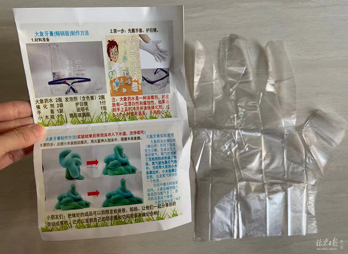 打开实验材料包,记者发现,两个装有液体的小瓶被放置在一个写有“大象药水”字样的密封袋内,但所谓的“大象药水”到底是什么材料,却并未标明。和说明书上标出的实验橡胶手套不同,记者从实验套装中掏出的却是一副薄薄的一次性塑料手套。