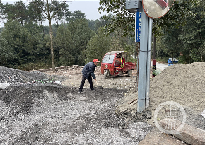 施工现场还堆放着河沙、石子等材料,上游新闻记者见到有人正在铲石子,此人正是修建停车场的村民申世友。申世友表示,自己家住在距离此地约500米的公路边,附近村民都是做花木生意,他想把此处整理出来摆放自家盆景供游人观赏、出售,同时也可以方便前来参观的游客停车。