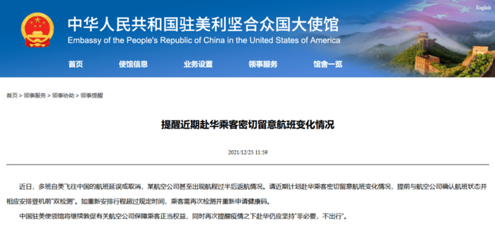 中国驻美国大使馆网站12月25日发布提醒称,近日,多班自美飞往中国的航班延误或取消,某航空公司甚至出现航程过半后返航情况。请近期计划赴华乘客密切留意航班变化情况,提前与航空公司确认航班状态并相应安排登机前“双检测”。