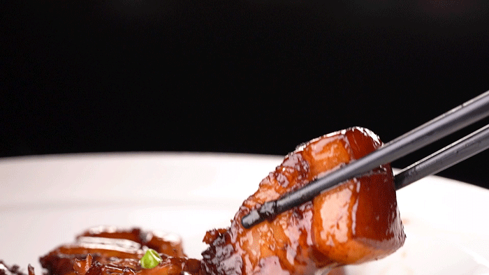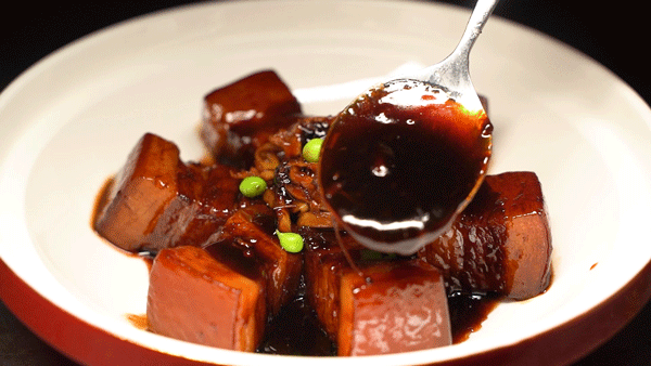 肥瘦相间的五花肉,出锅过后,浇上鲜香浓稠的酱汁,色香味俱全,口味咸鲜微甜,软烂Q弹!