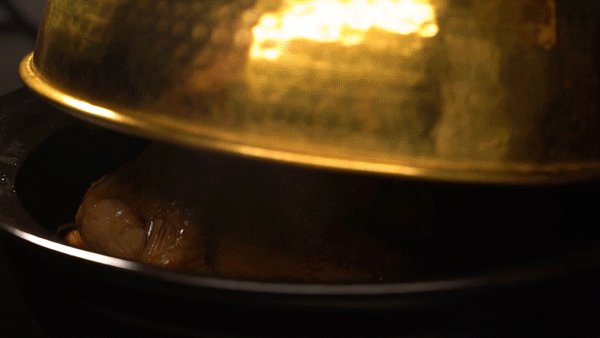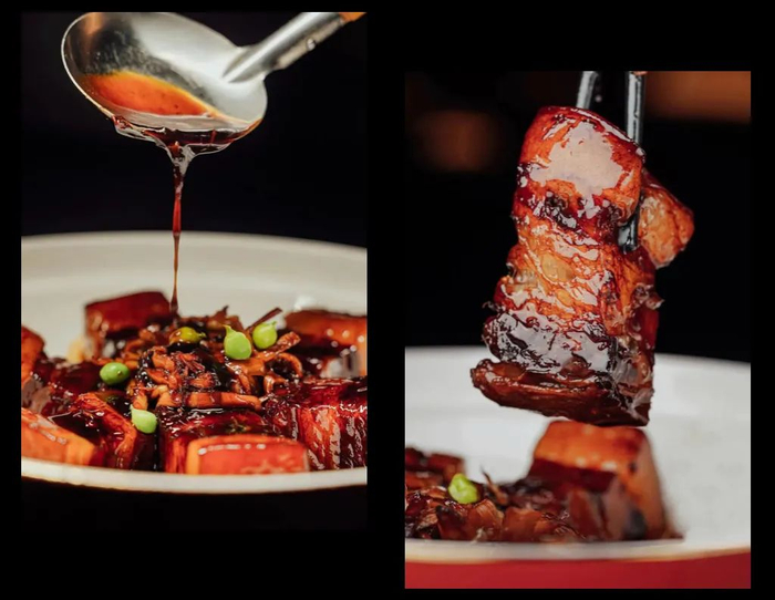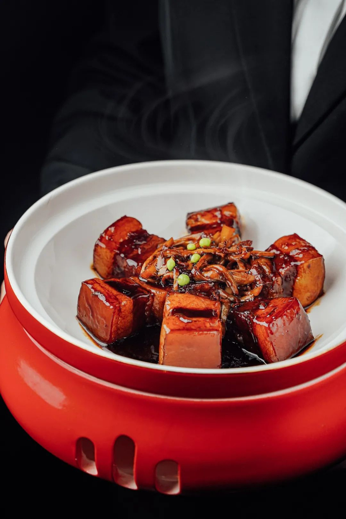 浓油赤酱的本帮红烧肉,精挑细选的五花三层,经过厨师耐心地改刀成3.5厘米见方的块儿,配葱姜及香料。烤箱烤制120分钟,出餐时配黄山扁笋尖!