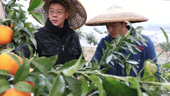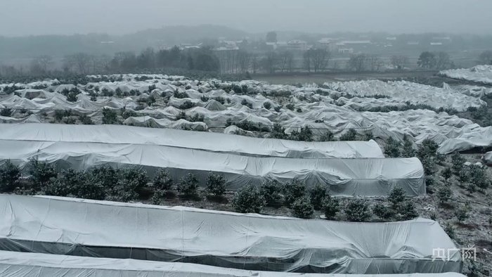 12月27日,在祁东县过水坪镇福炎村瑞旺沃柑基地,一株株沃柑树挂满了红彤彤的果实,丰收在望。镇村干部、农技专家与果农们一边就地商讨对策,一边冒着风雪紧急为沃柑果树覆盖薄膜,不断地铲除防寒膜上面的积雪,最大限度地减少天气对农业生产的影响。