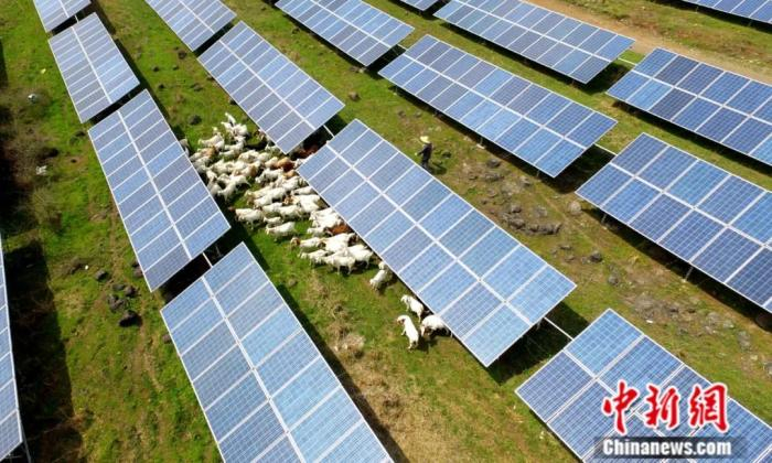 2017年3月28日,当地村民在江苏省盱眙县天泉湖镇光伏发电站内放羊。近年来,江苏省淮安市盱眙县天泉湖镇向荒山要效益,发展畜牧业和光伏互补的光伏发电项目。中新社发 颜怀峰 摄