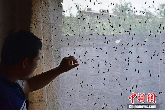 2021年8月3日,在广西壮族自治区南宁市武鸣区双桥镇平稳村黑水虻养殖场,工作人员在观察黑水虻的生长。中新社发 潘华清 摄